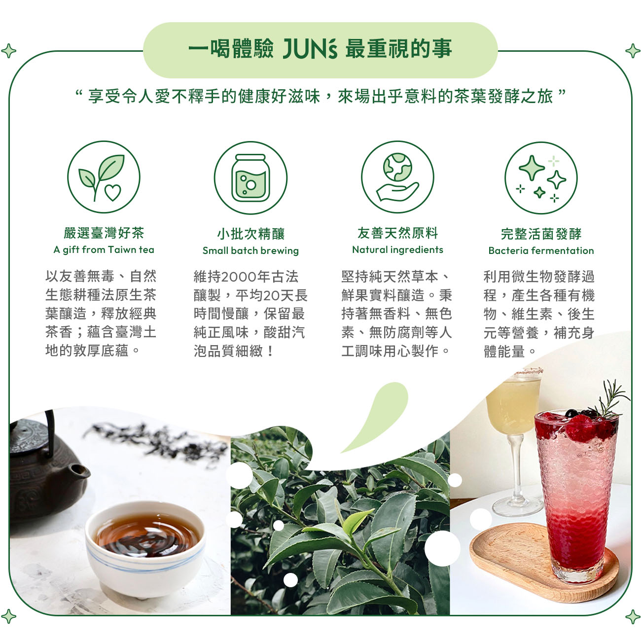 - 挑選友善環境臺灣自然生態茶葉,作為康普茶發酵基底。