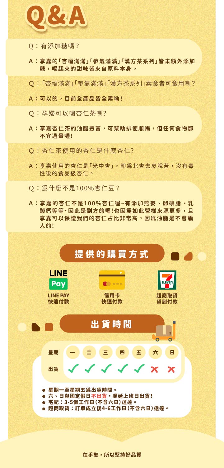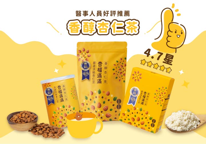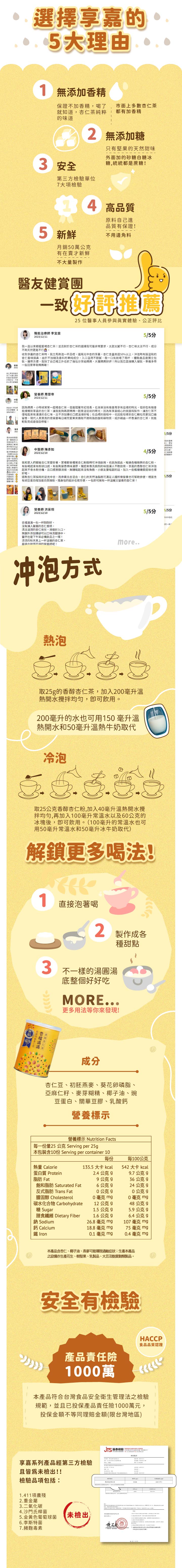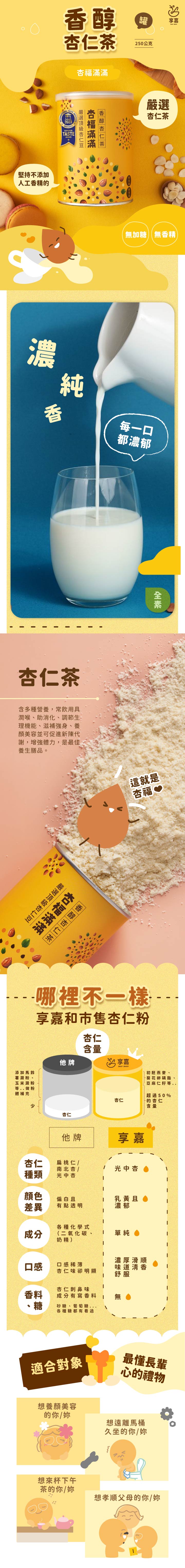 - 《杏仁茶》含多種營養,常飲用具潤喉、助消化、調節生理機能、滋補強身、養顏美容並可促進新陳代謝,增強體力,是最佳養生膳品。享嘉杏仁茶特選杏仁豆,製作過程衛生安全,食用方便適合早餐、宵夜點心,開水一沖即可享受的滋補茶點。