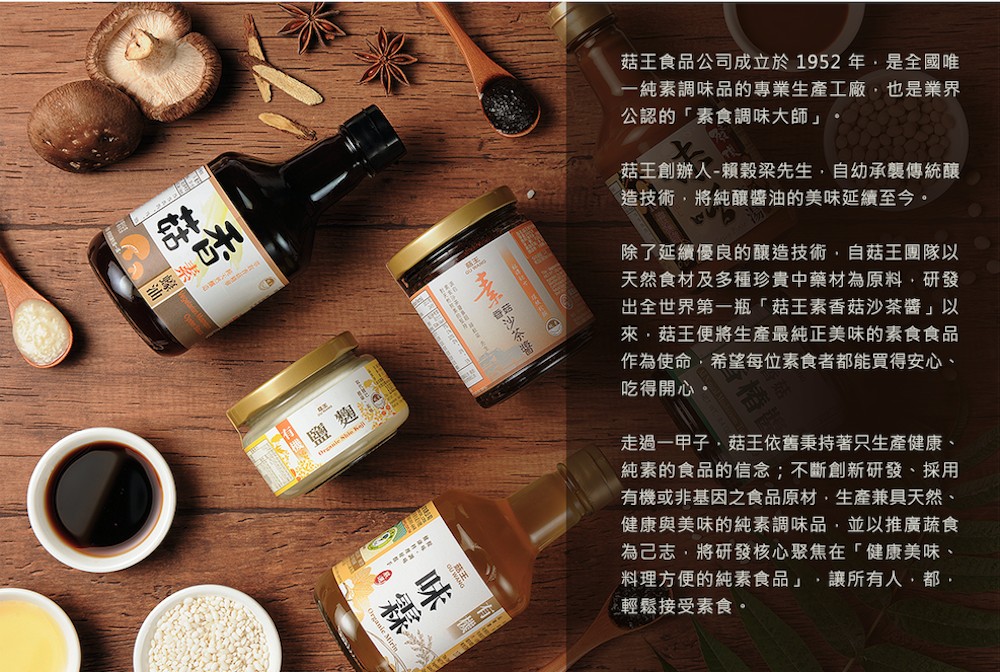 用上等香菇與精選麵筋,以黃金比例混合香料及調味料,再以健康黃豆油煮煎而成。用來作為素食料理的配料,及各式料理的內餡,都能增添食物的口感及美味。
